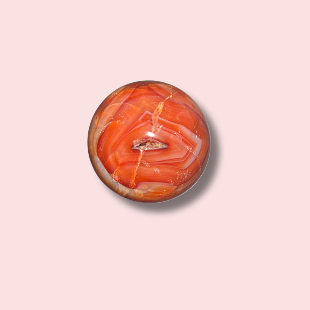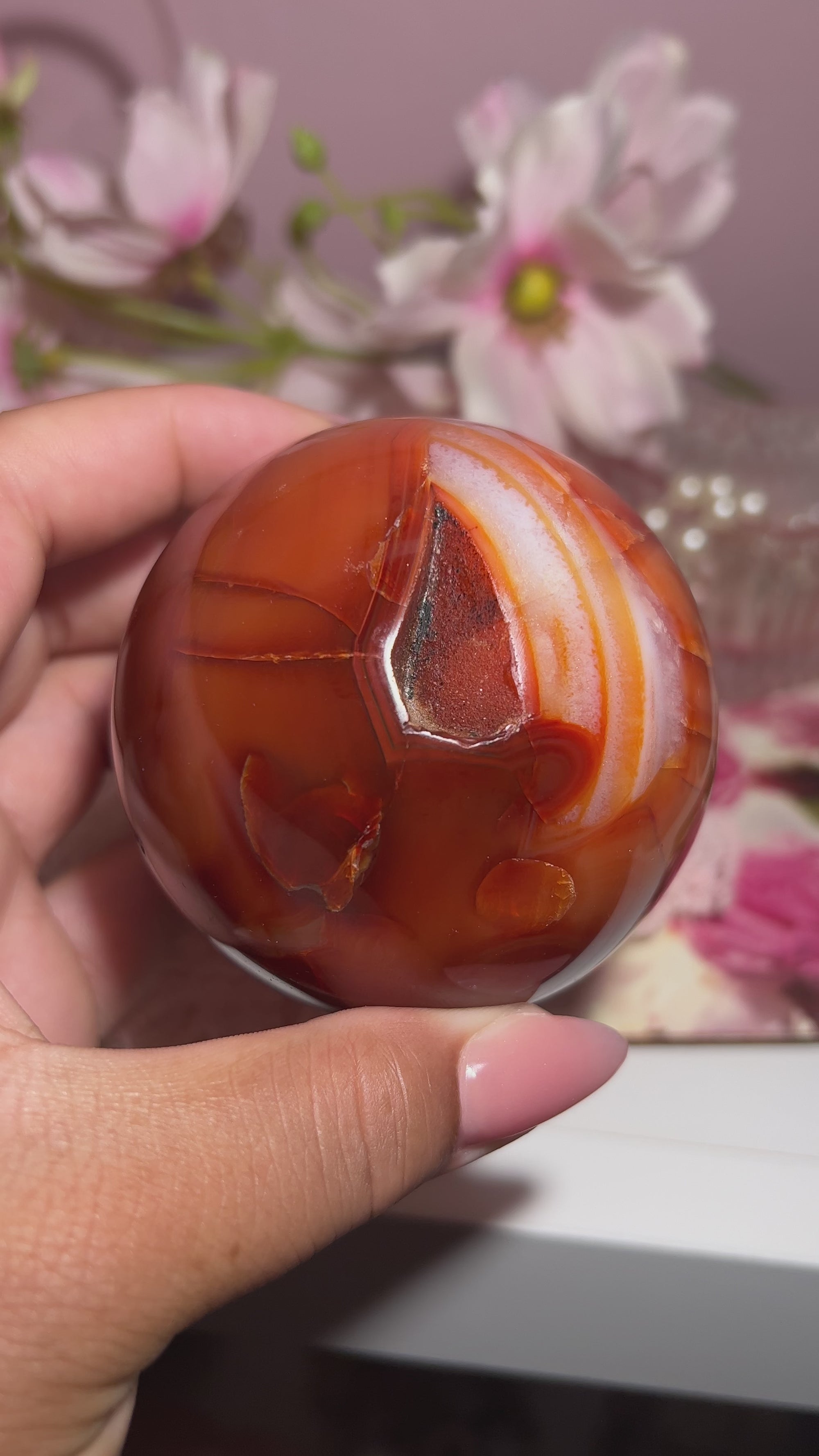 Stunning Banded Carnelian Sphere With Sparkly Druzy Cave